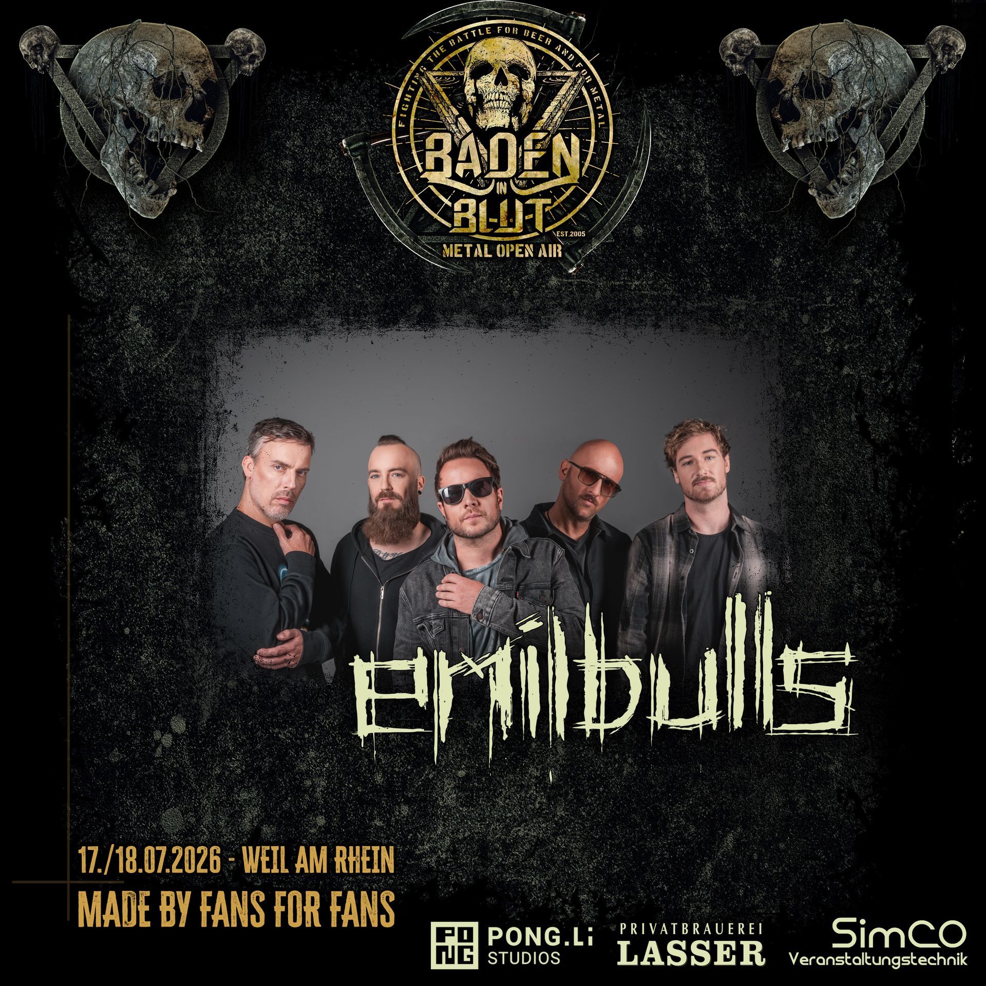 🌌⚡ 🇧🇪 EMIL BULLS– Alternative Metal from Germany! 🔥💀 BADEN IN BLUT 2026 - Weil am Rhein Sie verwandeln jede Bühne in ein Schlachtfeld aus Energie, Emotion und purer Spielfreude – EMIL BULLS kommen zum Baden in Blut Open Air 2026 und werden eindrucksvoll beweisen, warum sie seit vielen Jahren zu den beliebtesten Live-Acts der deutschen Modern-Metal- und Alternative-Szene zählen! Mit ihrem unverwechselbaren Mix aus Metal, Alternative und hymnischen Refrains haben die BULLS längst Kultstatus erreicht. Songs wie The Jaws of Oblivion, Worlds Apart oder When God Was Sleeping sind kraftvoll, ehrlich und immer mitreißend. Frontmann Christoph von Freydorf führt mit Charisma, Humor und einer mitreißenden Bühnenpräsenz durch Shows, die vom ersten bis zum letzten Ton brennen. Live sind EMIL BULLS pure Energie – sympathisch, tight und voller Abrisspotenzial. Kein Song ohne Mitsingmoment, kein Riff ohne Bewegung. Viele von uns sind seit Jahren Fans der Band – und wir haben auf genau den richtigen Moment gewartet, sie endlich aufs Baden in Blut zu holen. Der Moment ist gekommen! Am Samstag, den 18.07.2026, entfesseln EMIL BULLS beim Baden in Blut Open Air Eskalation pur. Freut euch auf eingängige Hooks, Abrissstimmung und eine Show, die lange nachglüht. Here Comes the Fire! 🔥 -------- English Version ------- EMIL BULLS They turn every stage into a battlefield of energy, emotion, and pure joy of playing – EMIL BULLS are coming to the Baden in Blut Open Air 2026, ready to show why they’ve been one of Germany’s most beloved modern metal live acts for years! With their unmistakable blend of metal, alternative elements and massive, anthemic choruses, the BULLS have long achieved cult status. Tracks like The Jaws of Oblivion, Worlds Apart or When God Was Sleeping hit hard, feel honest and ignite instantly. Frontman Christoph von Freydorf commands the crowd with charisma, humor, and a stage presence that keeps the fire burning from start to finish. Live, EMIL BULLS are explosive energy – tight, uplifting, and absolutely unstoppable. Not a single song without a sing-along moment, not a single riff without movement. Many of us have been fans for years – and we’ve waited for the perfect moment to bring them to Baden in Blut. Now is the time! On Saturday, July 18th, 2026, EMIL BULLS will deliver pure escalation at the Baden in Blut Open Air. Expect soaring hooks, high-octane energy, and a show that will stick with you long after the final note fades. Here Comes the Fire! 🔥