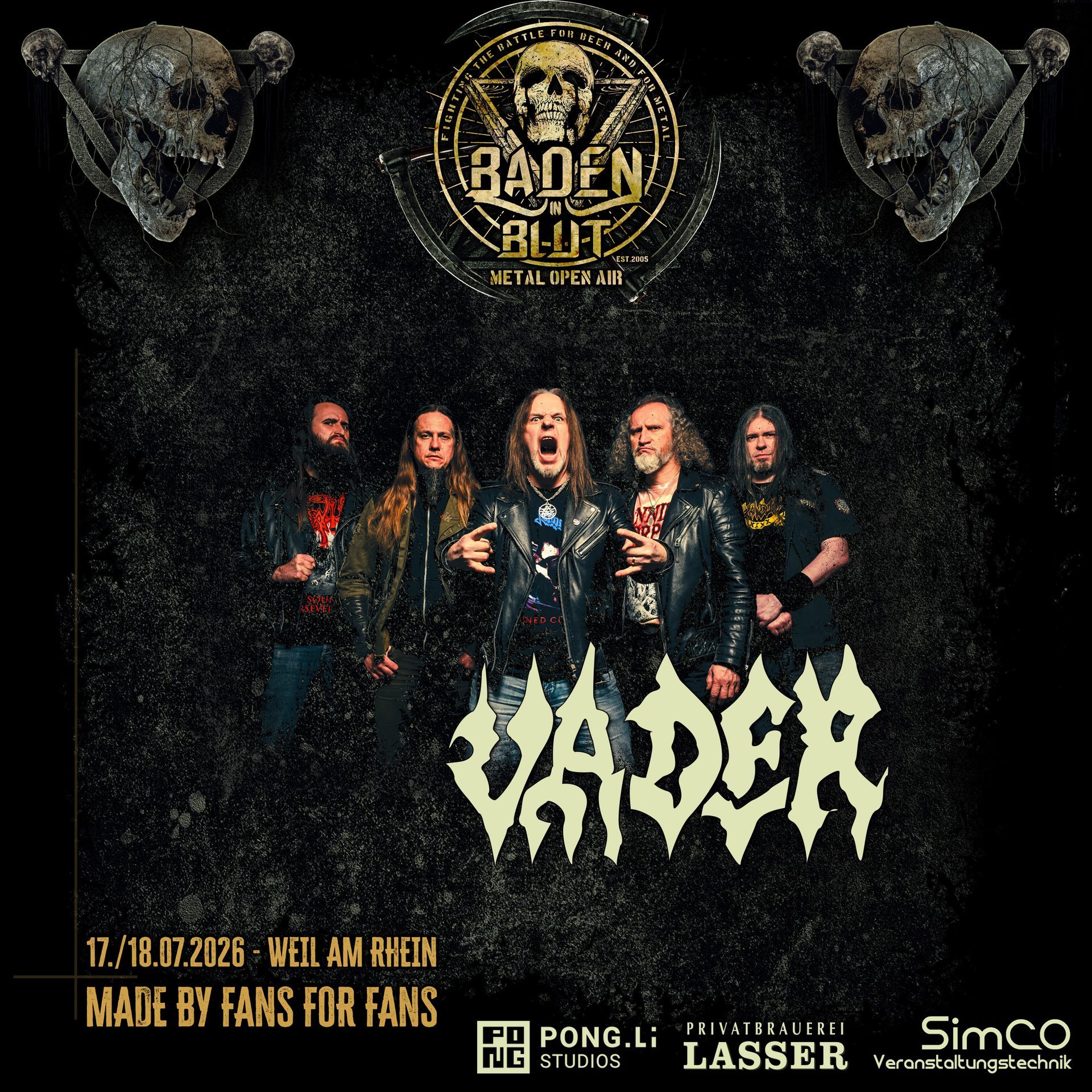 Freitag, 17. Juli 2026 VADER werden beim Baden in Blut Open Air 2026 zweifellos zu den absoluten Höhepunkten gehören. Bereitet euch auf ein Massaker aus Geschwindigkeit, Präzision und purer Energie vor – die Legenden sind zurück! ๐ฅ Watch some “Impressions in Blood”! ๐ฅ ๐ฌ๐ง English Version ๐ต๐ฑ VADER – Poland’s Death Metal Machine Returns! ๐ฅ๐ When relentless blast beats tear through the air and razor-sharp riffs slice like blades, when decades of experience fuse with unbroken aggression – you know what it means: VADER are returning to lay waste to Baden in Blut Open Air 2026! โก Founded in 1983, the Polish death metal veterans stand as one of the unshakable pillars of the genre. With classics like Litany (2000), Revelations (2002), and Tibi et Igni (2014), VADER have shaped European death metal with precision, relentlessness, and their unmistakably punishing, tightly executed energy. ๐ฅ Led by Piotr “Peter” Wiwczarek, VADER unleash a live onslaught of technical mastery and crushing force. Every song is a punch to the gut, every riff a projectile aimed straight at your skull. No compromises. No mercy. Just death metal in its purest form. Since 2024, founding guitarist Mauser has also returned to the ranks – which means one thing: Triple Guitar Power and a live wall of sound designed to annihilate everything in its path. โ๏ธ ๐
